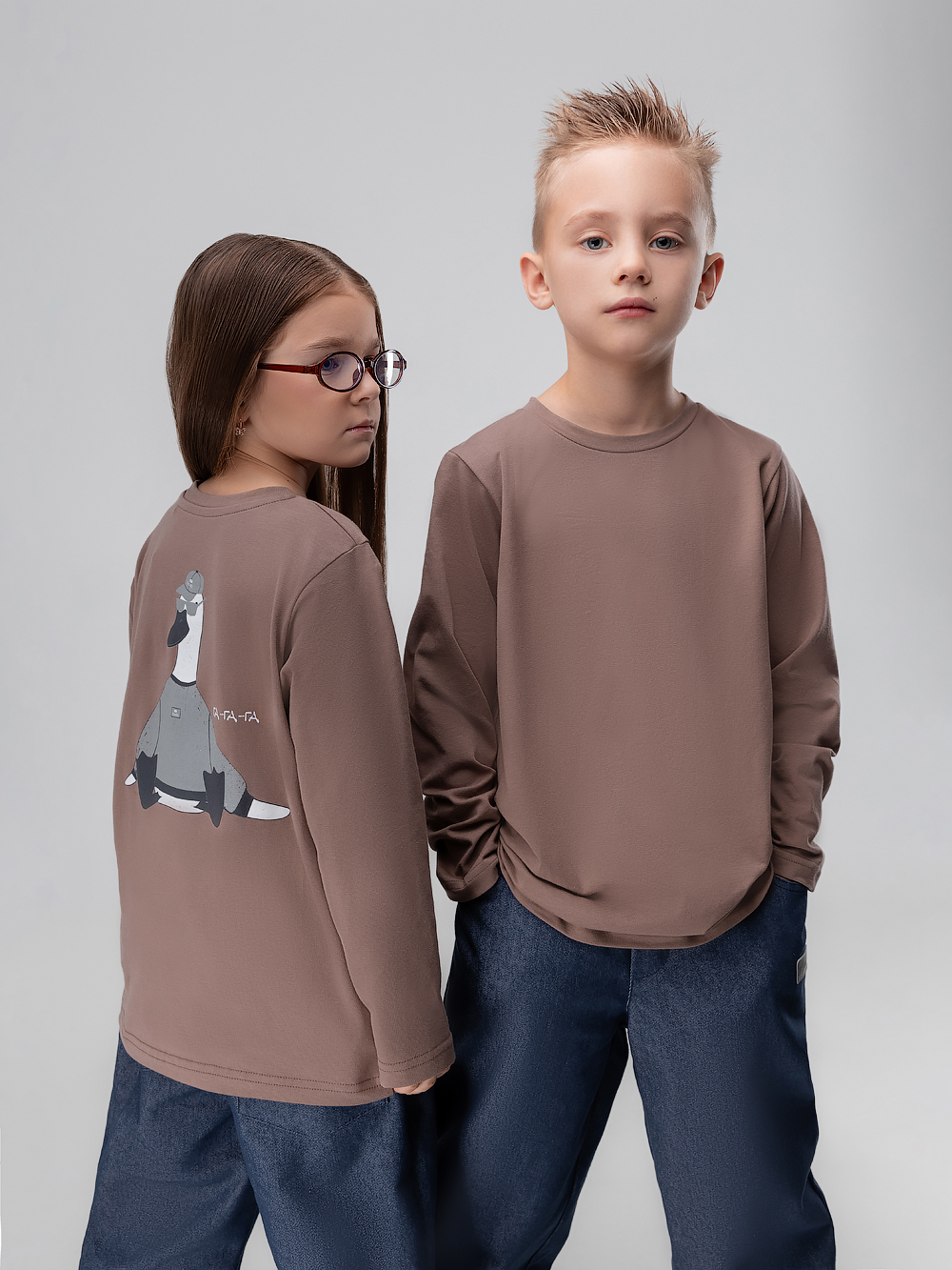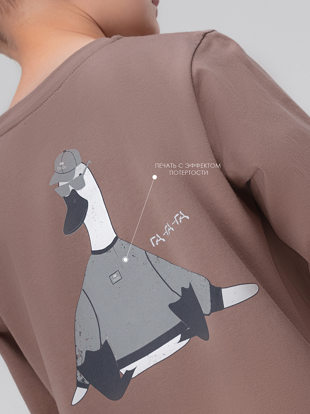 Свободный лонгслив с длинным рукавом. Горловина футболки округлой формы. Низ изделия прямой. Принт "Гусь" на спине.