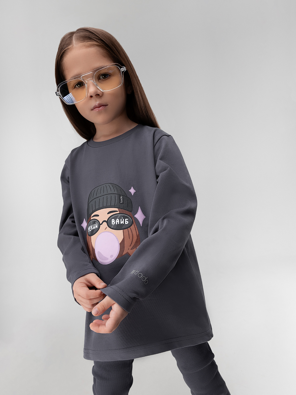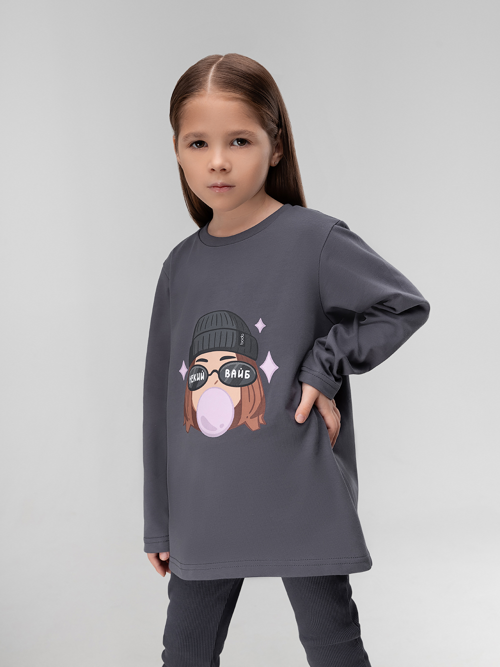 Лонгслив свободного силуэта с длинным рукавом. Горловина лонгслива округлой формы. Низ изделия прямой. На полочке располагается принт