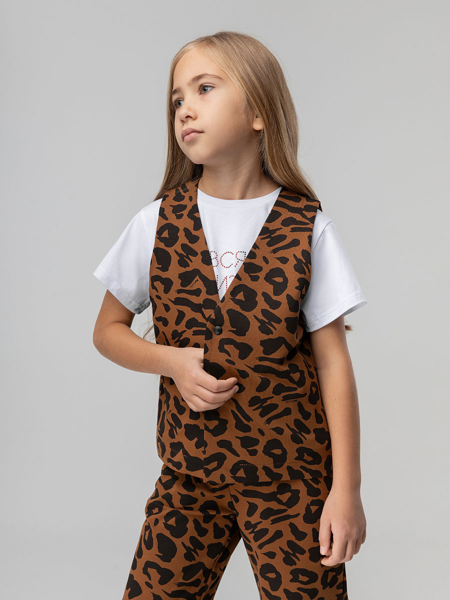 Жилет для детей дошкольного возраста. Жилет без подкладки, свободного силуэта, с центральной бортовой застёжкой на кнопки, вырез по горловине v- образный. Низ изделия прямой.
