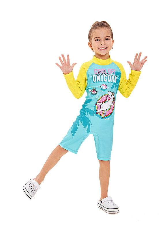 Купальный комбинезон Ансе с длинными рукавами для девочки. Быстросохнущий и эластичный материал, который имеет высокую степень защиты от солнечных лучей SPF 50+. Ткань легкая, приятная к телу и сохраняет форму и цвет после воздействий солнца и моря. Благодаря эргономичному крою, качественным современным материалам и плоским швам, костюм не стесняет движений в воде и на суше. Длинные рукава-реглан защитят от жаркого солнца на пляже. Легко переодеться, благодаря молниям на спинке и между ножек. Воротник-стойка убережет шею ребенка от солнечных лучей. Молния по спинке с защитной планкой и уголком, для бережного застегивания. Яркая расцветка купальника и забавный принт с единорогом создадут летнее настроение. Комбинезон отлично сочетается с защитной кепкой или панамой от солнца и аквашузами от OLDOS.