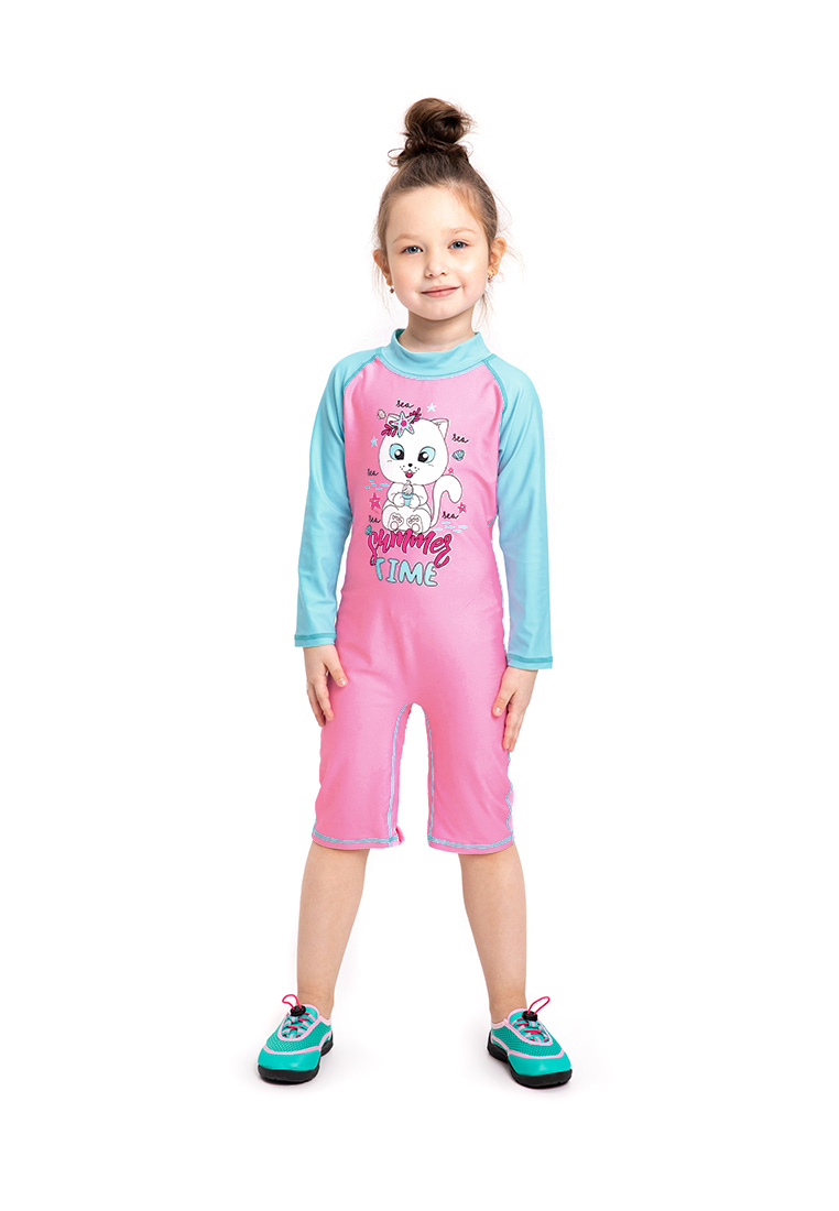 Купальный комбинезон с защитой от солнечных лучей SPF 50 для девочки. Длинные рукава, воротник-стойка и удлиненные шортики защитят самые нежные участки и сделают пребывание на солнце максимально безопасным для кожи. Благодаря балансу нейлона и спандекса в составе ткани, комбинезон легкий, эластичный, гипоалергенный и дышащий, мягко прилегающий к телу и дарящий при этом полную свободу движений. Он быстро сохнет и легко очищается от любых загрязнений. В дизайне использованы нежные припыленные оттенки и милый принт, устойчивый к внешнему воздействию, сохраняющий свой вид весь период использования. Надевание и снятие комбинезона удобно даже для самых маленьких деток: есть молния до середины спинки и дополнительная полностью разъемная молния между ножек. Эргономичный крой и плоские швы делают комбинезон максимально комфортным для любой деятельности: купания, активных детских игр на суше, прогулок вдоль берега моря или в лесу рядом с озером. 82% нейлон, 18% спандекс, солнцезащита SPF 50+