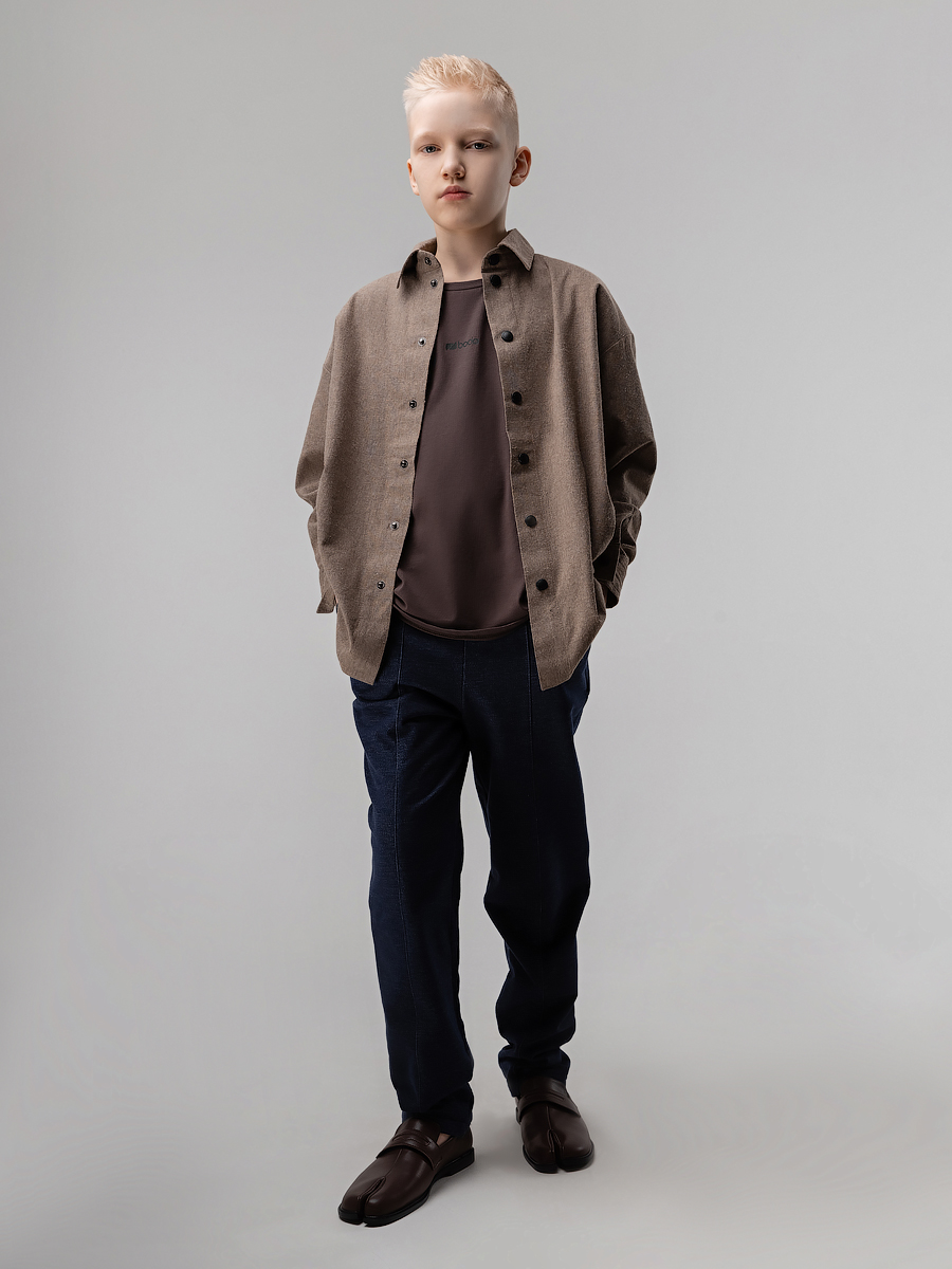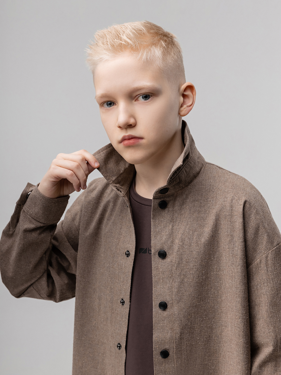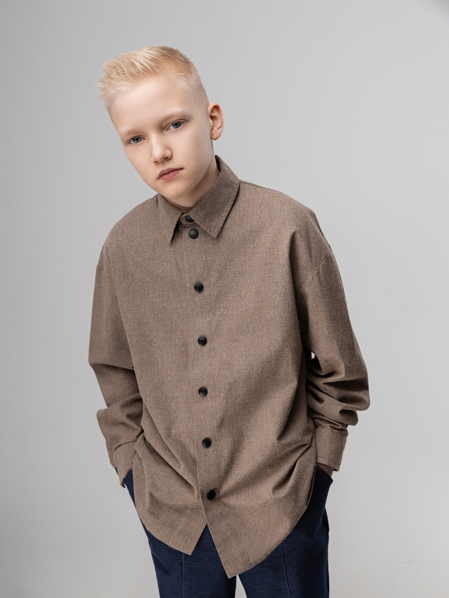 Рубашка для детей школьного возраста. Рубашка без подкладки, прямого силуэта, с центральной бортовой застёжкой на кнопки, с отложным воротником со стойкой, с втачными рукавами с притачной манжетой на кнопке. Низ изделия прямой. По низу рукава — защип.