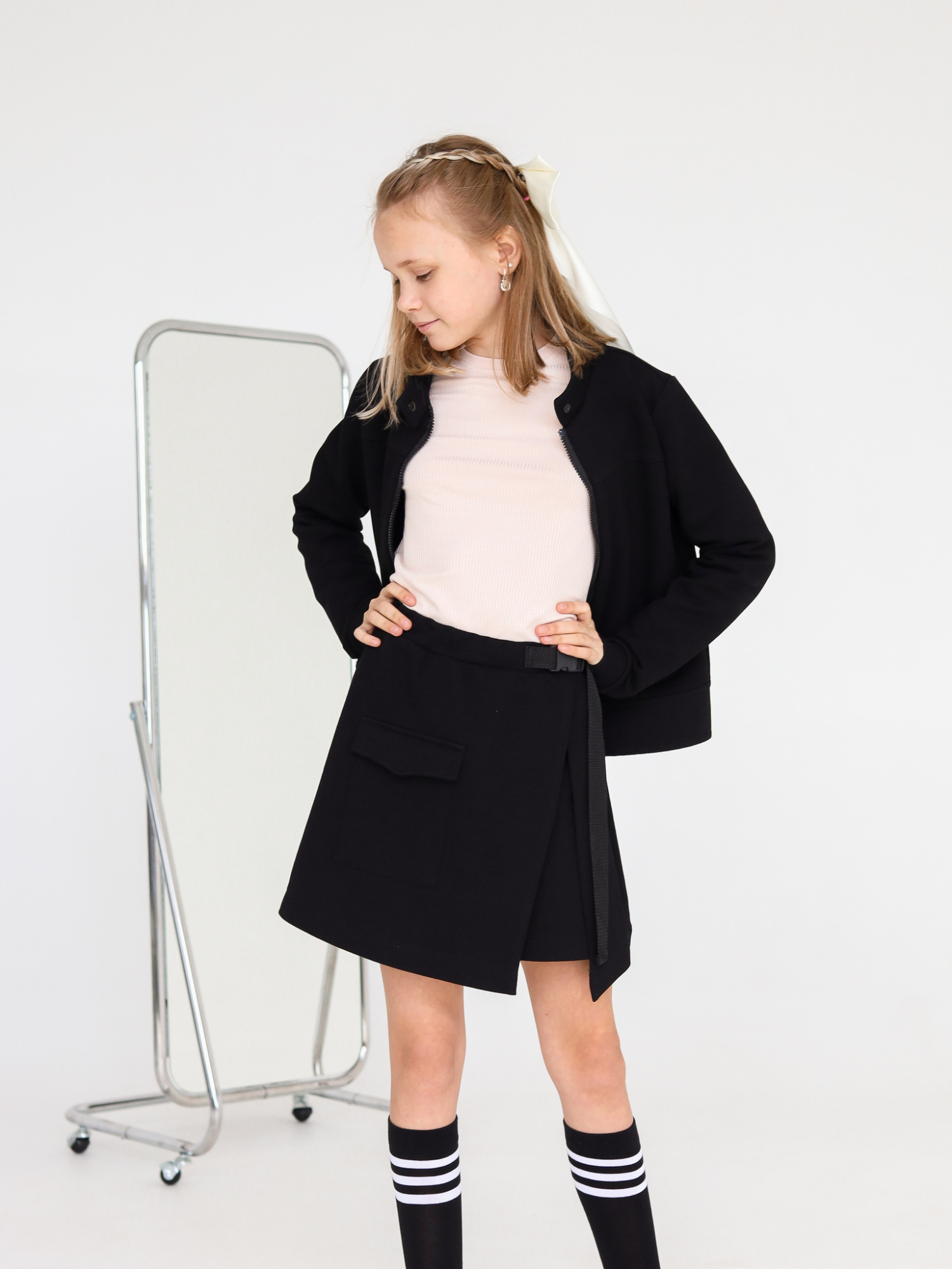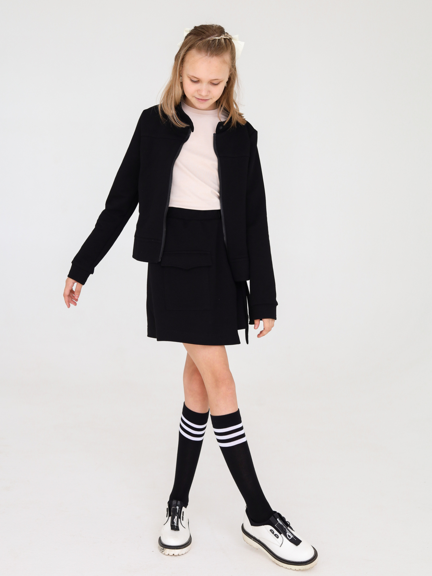 Трикотажная куртка на замке - отличный выбор для девочки на 1 сентября и на каждый день в школу. Эта куртка идеально подходит для создания комфортного и стильного образа. Она очень удобная и практичная, идеально подходит для активных школьных занятий. Ткань, из которой сделана куртка, имеет натуральный состав, что делает ее максимально комфортной для длительной носки. Она также обеспечивает тепло в холодное время года. Куртка имеет модный дизайн и стойкий воротник-стойку, который придает ей элегантный вид. Благодаря этому, она прекрасно сочетается с разными образами и может быть легко включена в школьную форму. Благодаря своим преимуществам - удобству, практичности, теплоте и натуральности тканей, эта трикотажная куртка станет незаменимой частью гардероба вашей девочки на каждый день в школу.