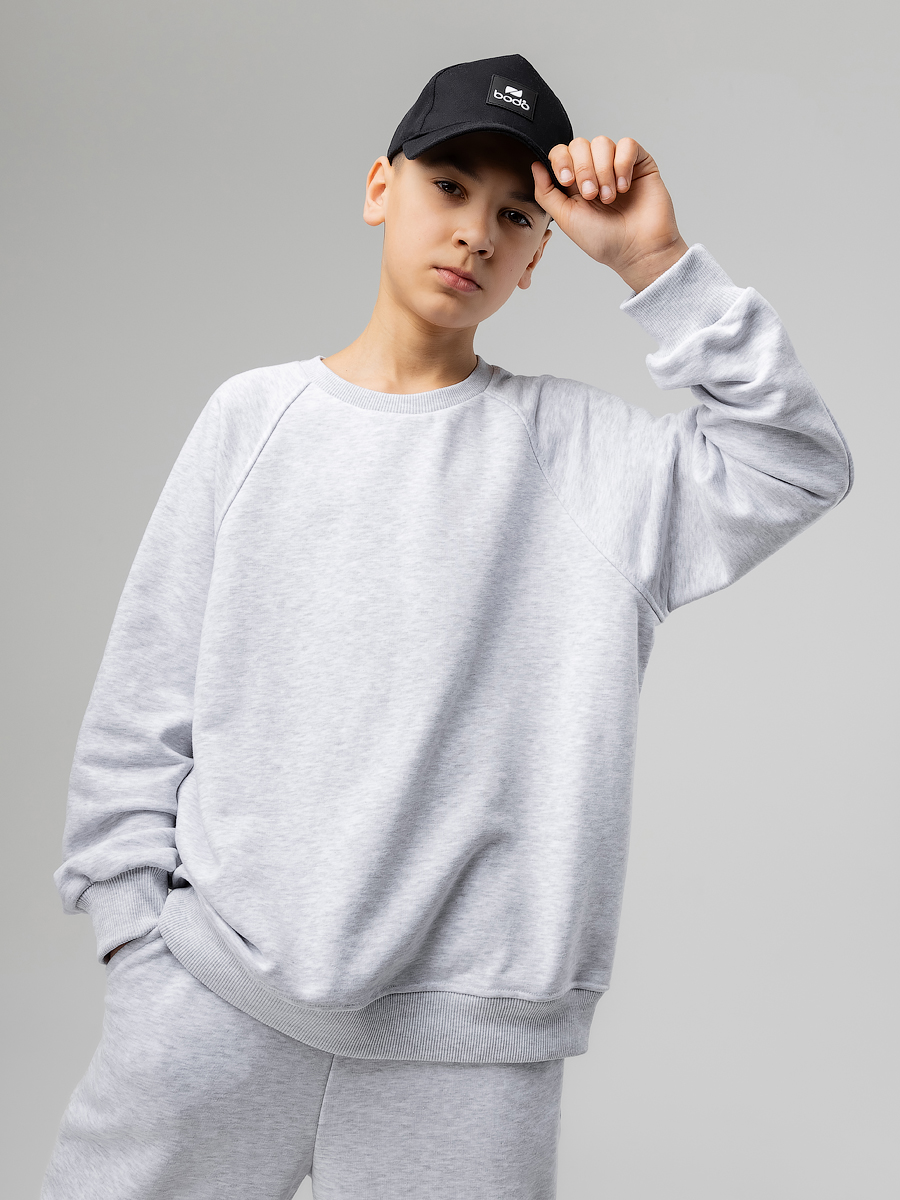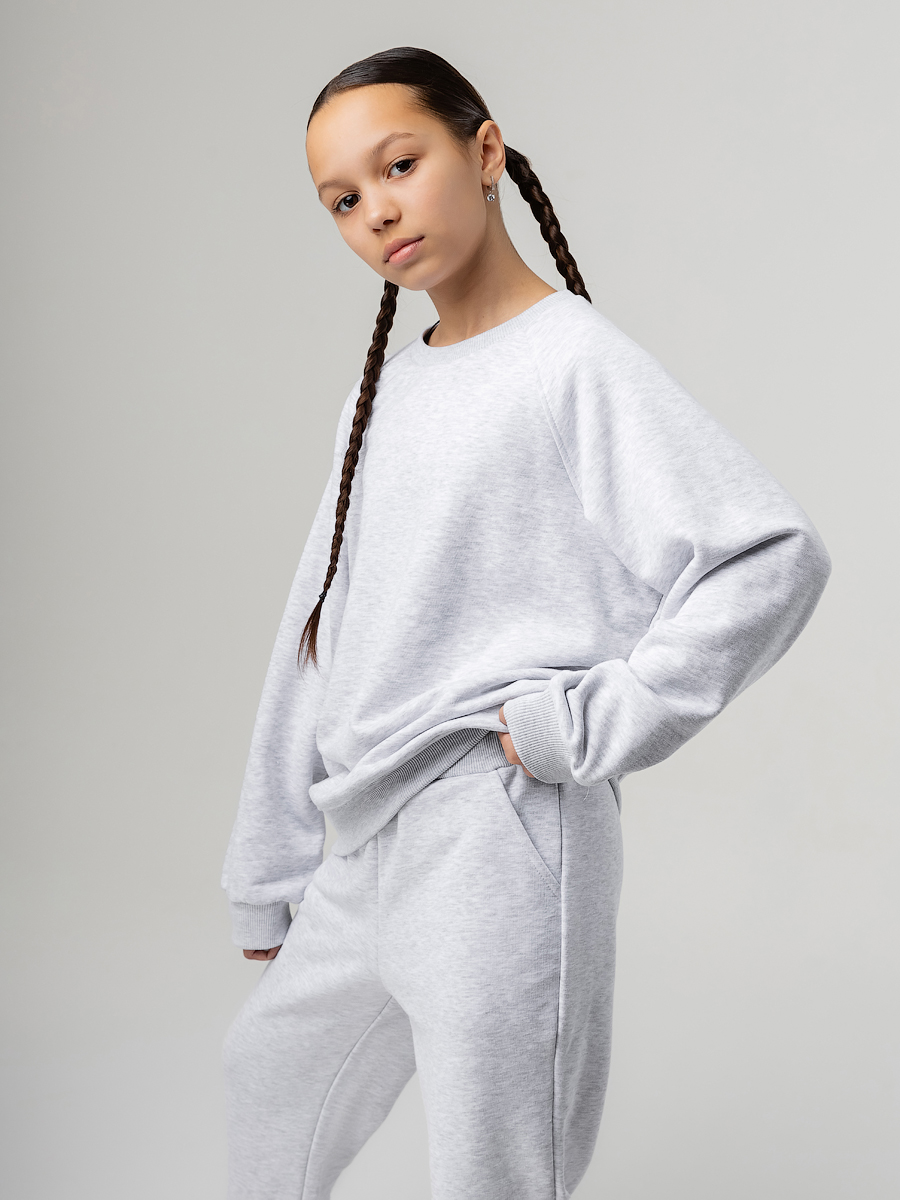 Свитшот для детей школьного возраста. Свободного силуэта с втачным рукавом реглан с притачной манжетой, с притачным поясом по низу изделия. Горловина округлой формы. Состав: футер трехнитка петля 80% хлопок 20% полиэстер