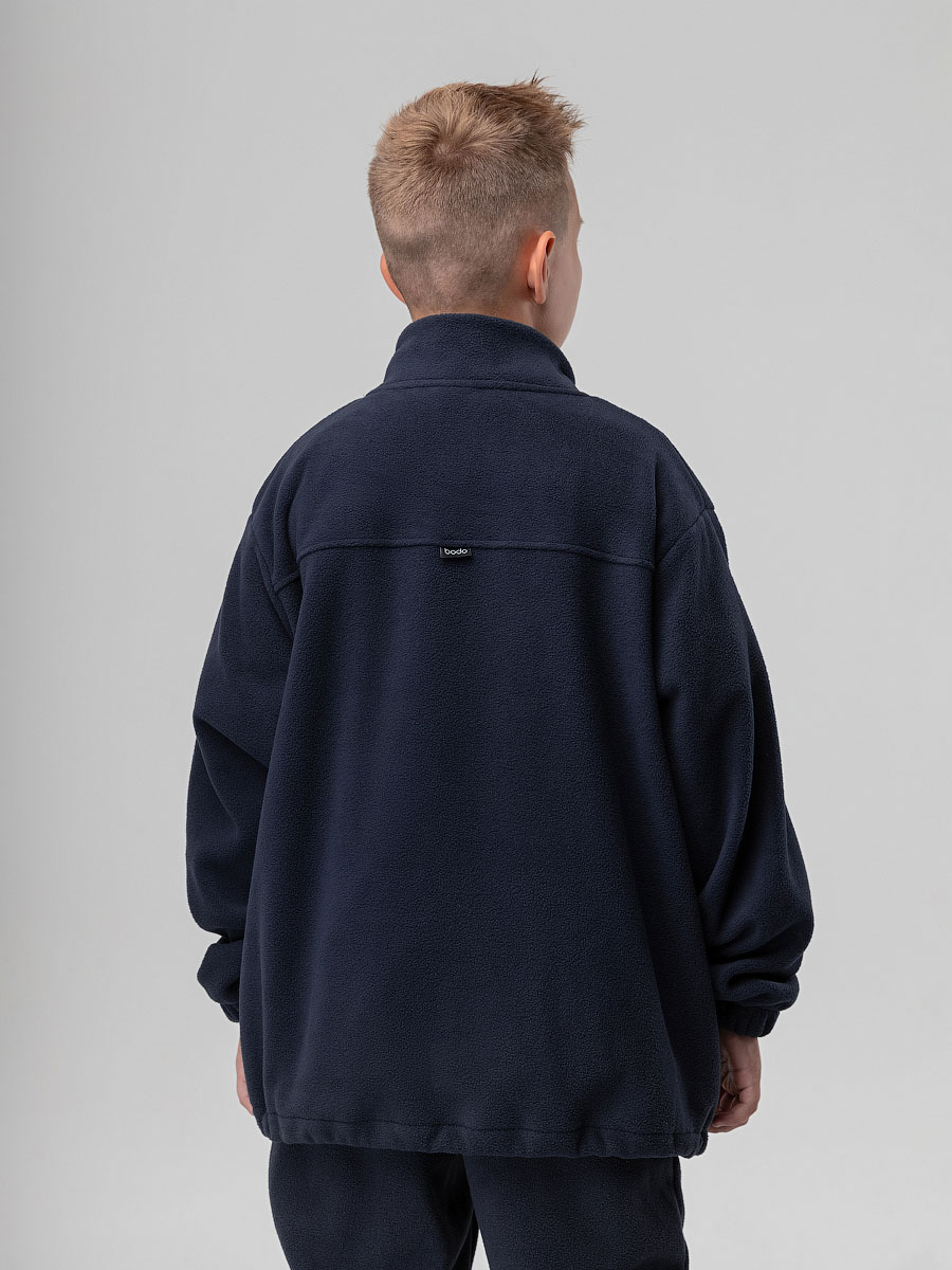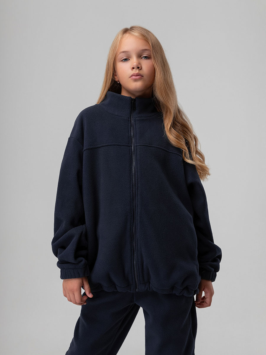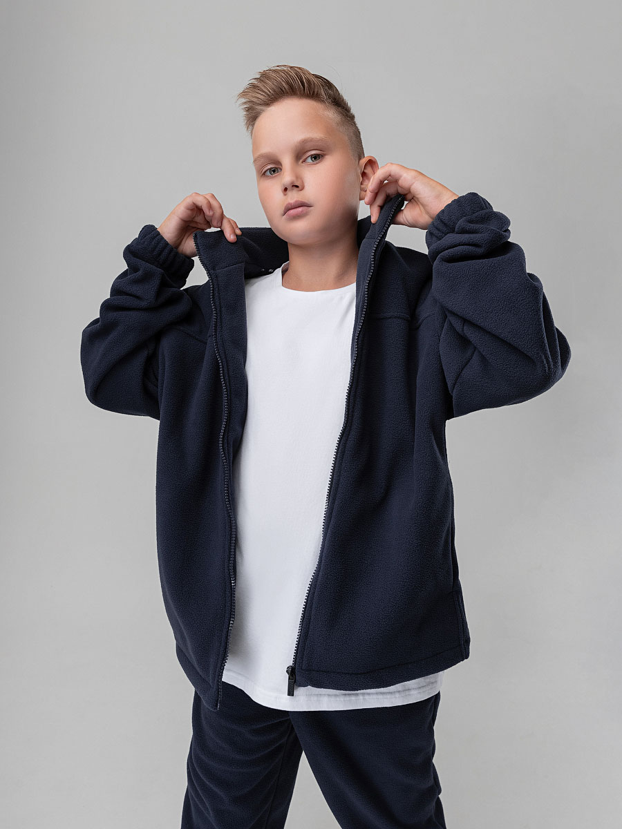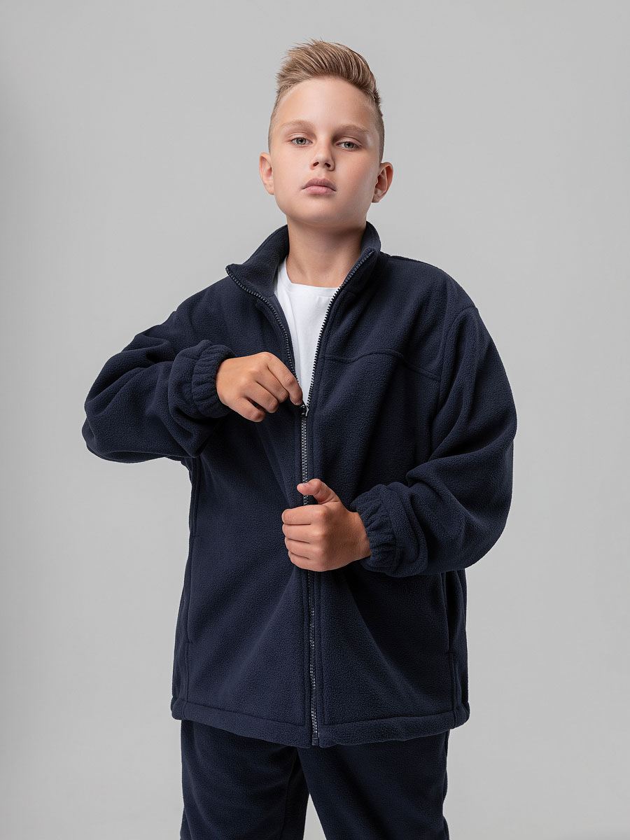 Толстовка для детей школьного возраста. Толстовка прямого силуэта, с центральной бортовой застёжкой на тесьму молния, воротник стойка, со спущенной линией плеча, с втачными рукавами на манжете с внутренней резинкой, на полочке располагаются карманы, низ изделия прямой, по низу имеется дополнительная резинка с фиксатором для затяжки. Толстовка выполнена из качественного флиса плотностью 240г