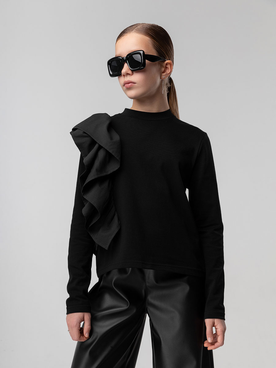 Лонгслив для детей школьного возраста. Лонгслив прямого силуэта с объёмным воланом, с длинным рукавом, воротник стойка. Низ изделия и низ рукавов прямой.