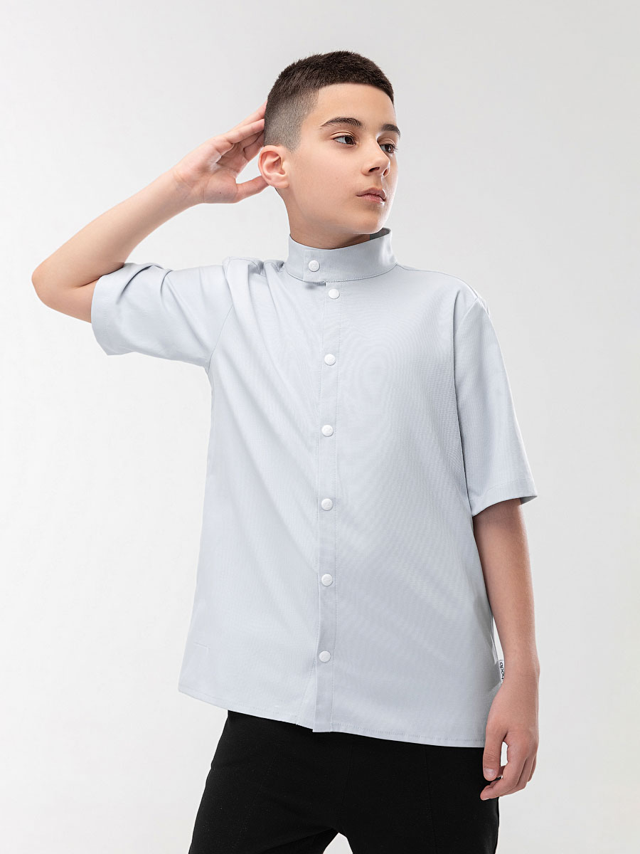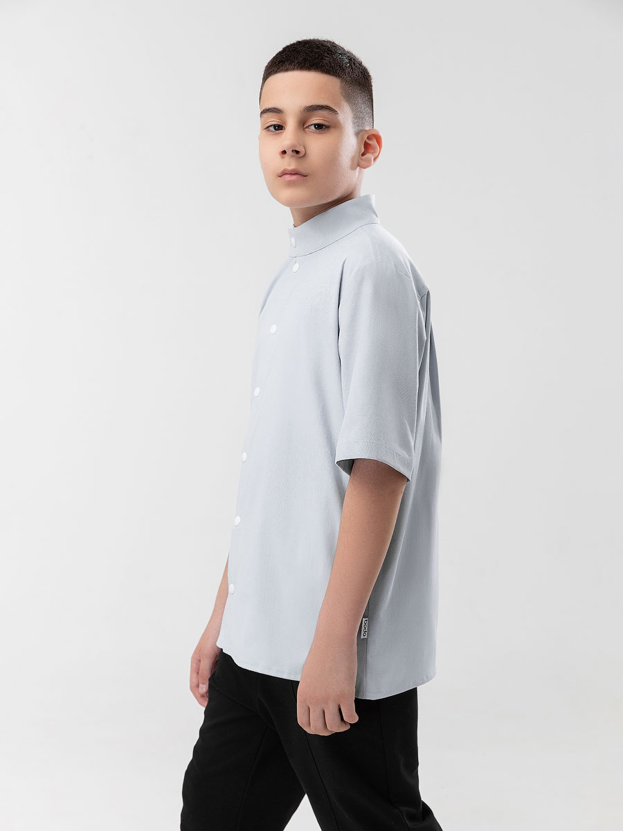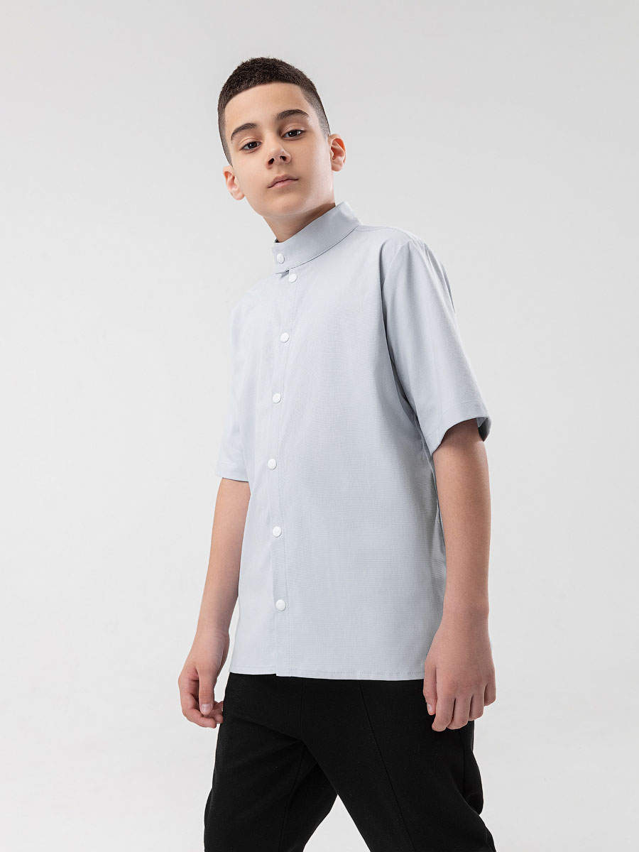 Рубашка для детей школьного возраста. Рубашка без подкладки, прямого силуэта, с центральной бортовой застёжкой на кнопки, с воротником-стойка, с втачным коротким рукавом. Низ изделия прямой.