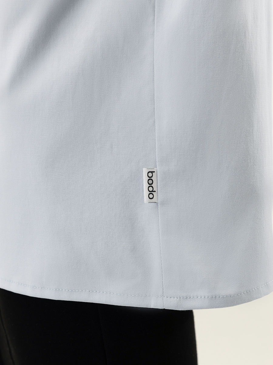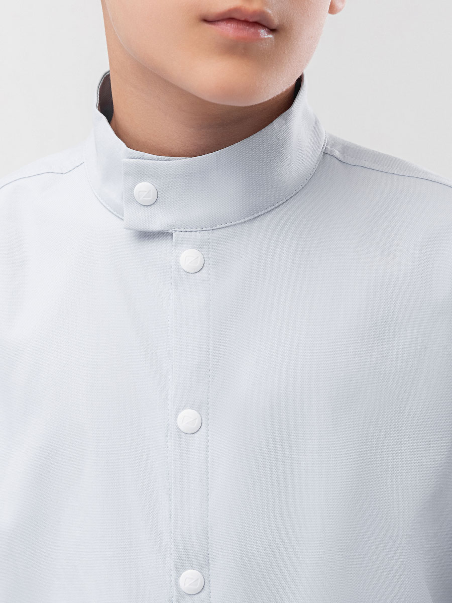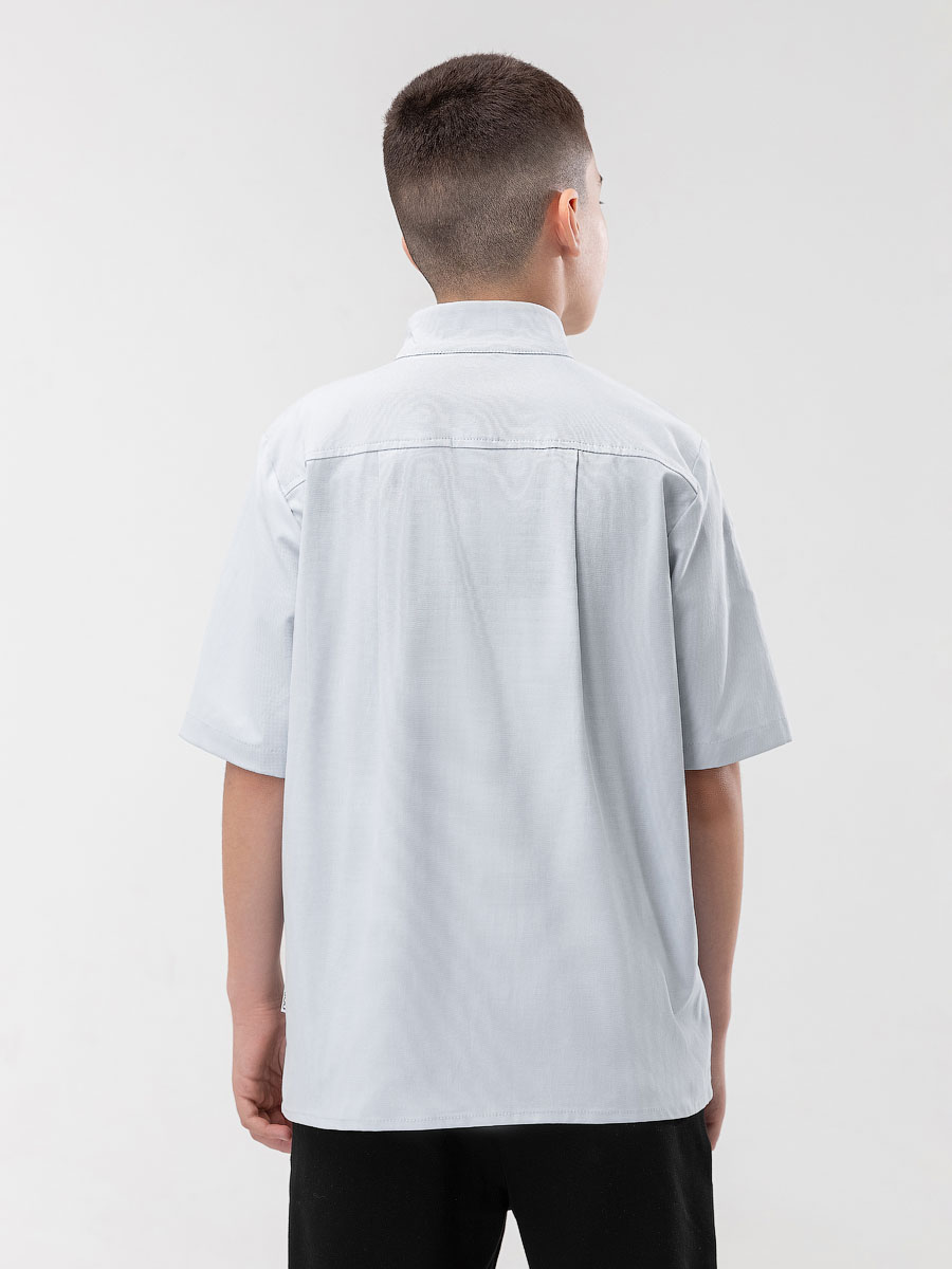 Рубашка для детей школьного возраста. Рубашка без подкладки, прямого силуэта, с центральной бортовой застёжкой на кнопки, с воротником-стойка, с втачным коротким рукавом. Низ изделия прямой.