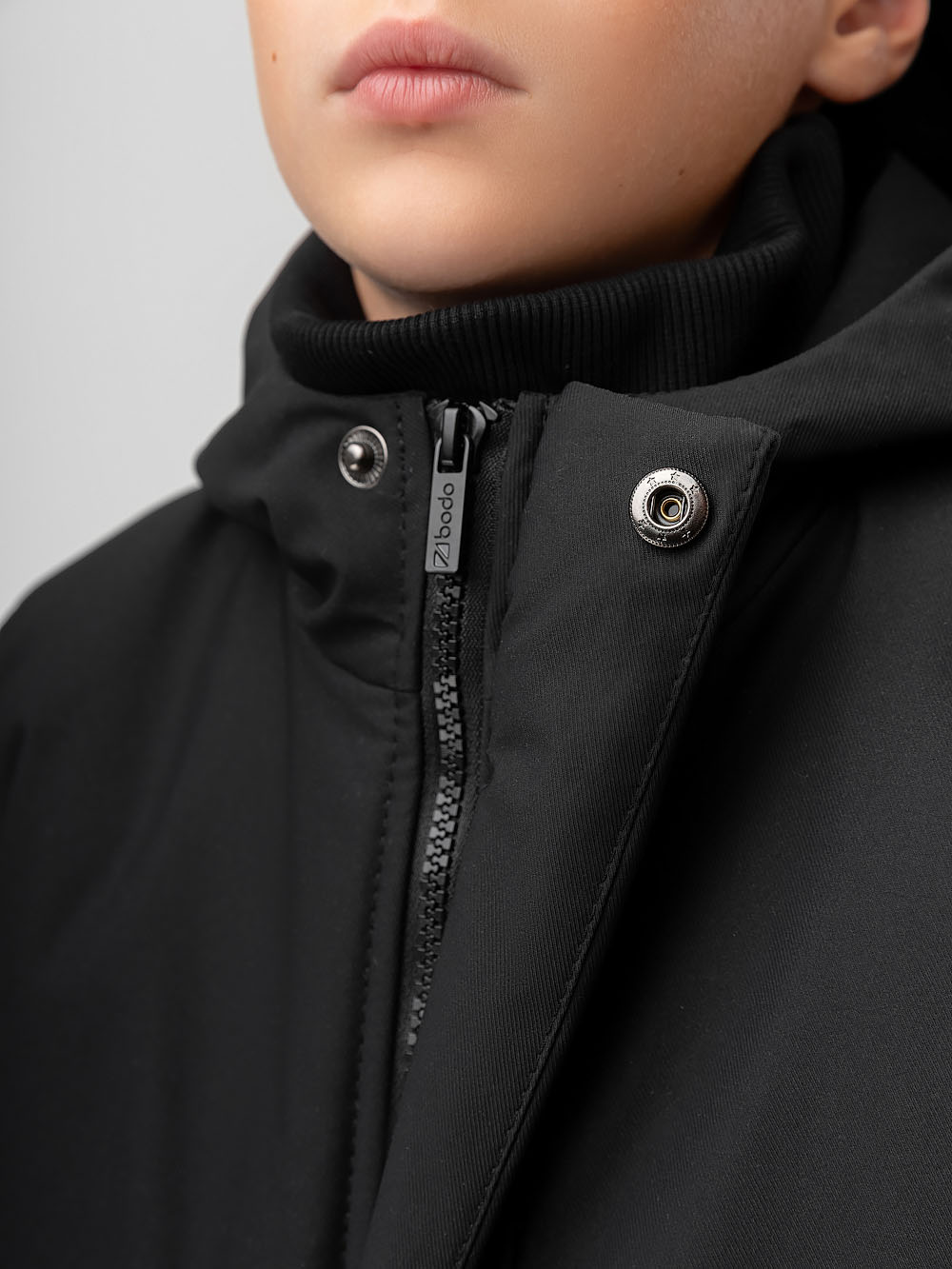 Куртка на молнии, закрытая ветрозащитной планкой с потайными кнопками. Карманы расположены в боковых швах. Свободные, утепленные брюки, низ изделия на резинке и со штрипками. Светоотражающий кант по боковым швам.