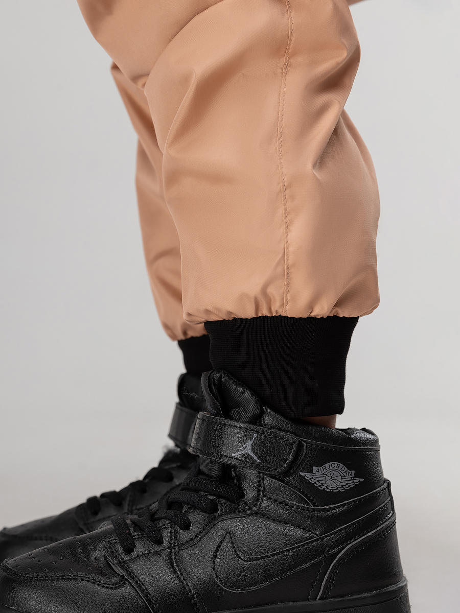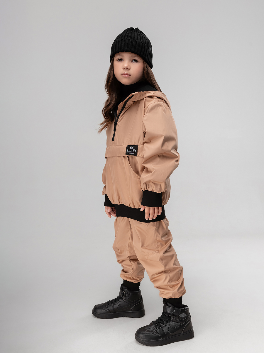 Костюм из плотного и стойкого к изнашиванию и повреждениям материала Дюспо. Анорак, детали: сквозные боковые карманы, несъемный капюшон на стойке закрывает шею, молния с защитой подбородка. Анорак надевается через голову. Брюки - джоггеры, пояс - эластичная резинка, низ изделия- манжеты.