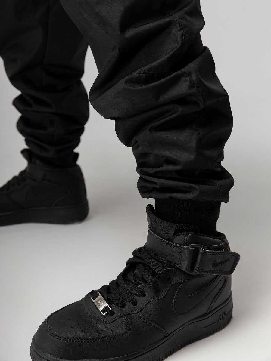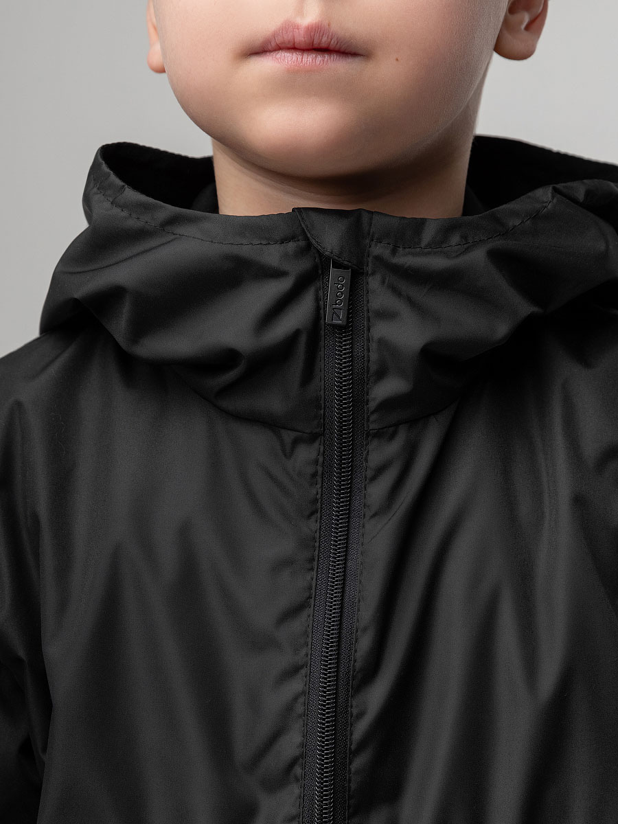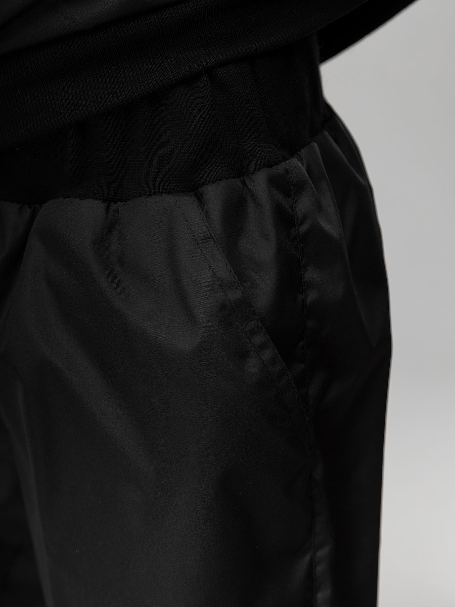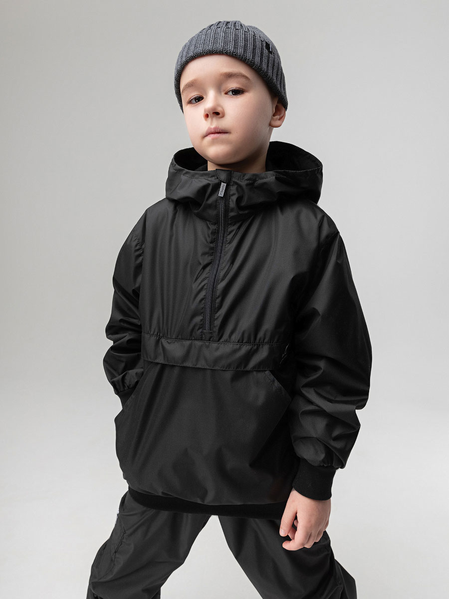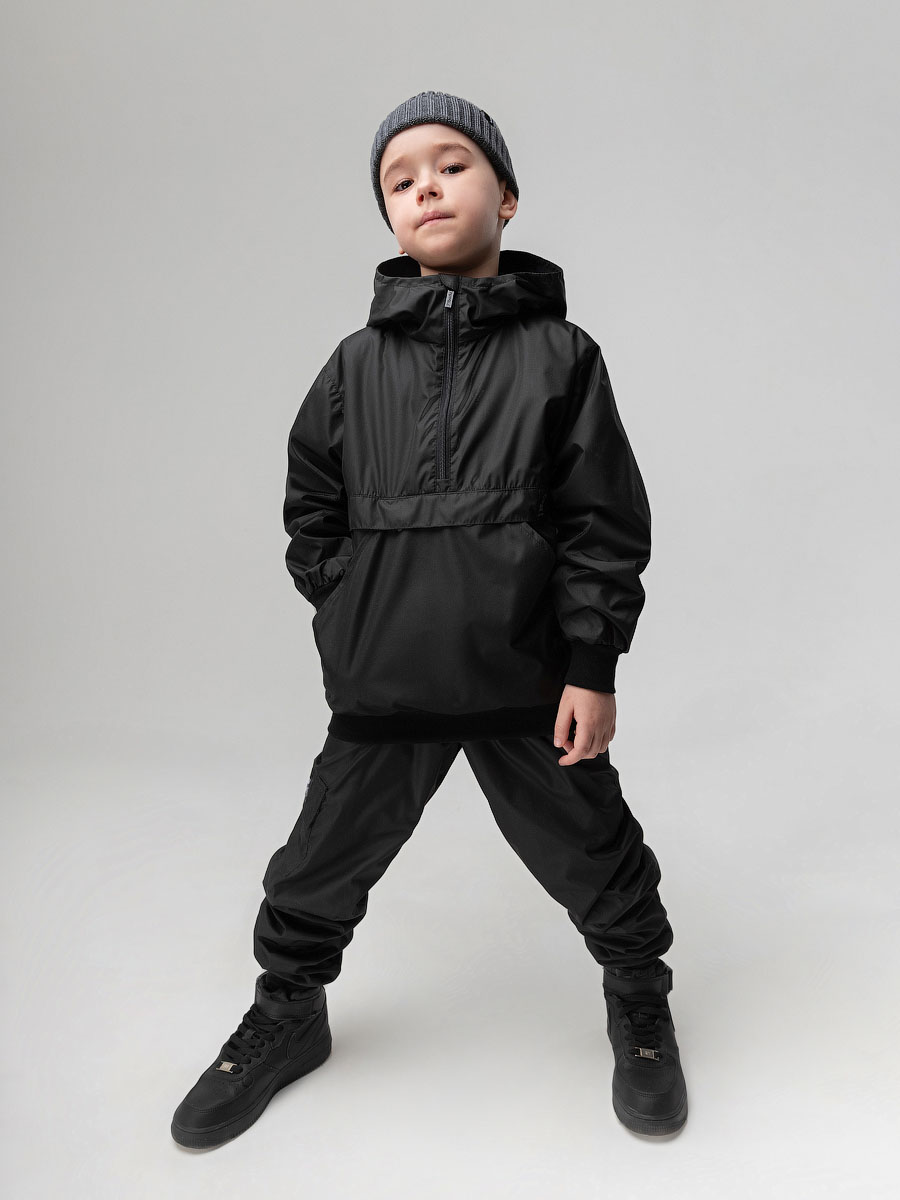 Костюм из плотного и стойкого к изнашиванию и повреждениям материала Дюспо. Анорак, детали: сквозные боковые карманы, несъемный капюшон на стойке закрывает шею, молния с защитой подбородка. Анорак надевается через голову. Брюки - джоггеры, пояс - эластичная резинка, низ изделия- манжеты.